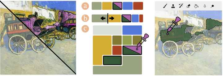Color design is essential in areas such as product, graphic, and fashion design. However, current tools like Photoshop, with their concrete-driven color manipulation approach, often stumble during early ideation, favoring polished end results over initial exploration. We introduced Mondrian as a test-bed for abstraction-driven approach using interactive color palettes for image colorization. Through a formative study with six design experts, we selected three design options for visual abstractions in color design and developed Mondrian where humans work with abstractions and AI manages the concrete aspects. We carried out a user study to understand the benefits and challenges of each abstraction format and compare the Mondrian with Photoshop. A survey involving 100 participants further examined the influence of each abstraction format on color composition perceptions. Findings suggest that interactive visual abstractions encourage a non-linear exploration workflow and an open mindset during ideation, thus providing better creative affordance.